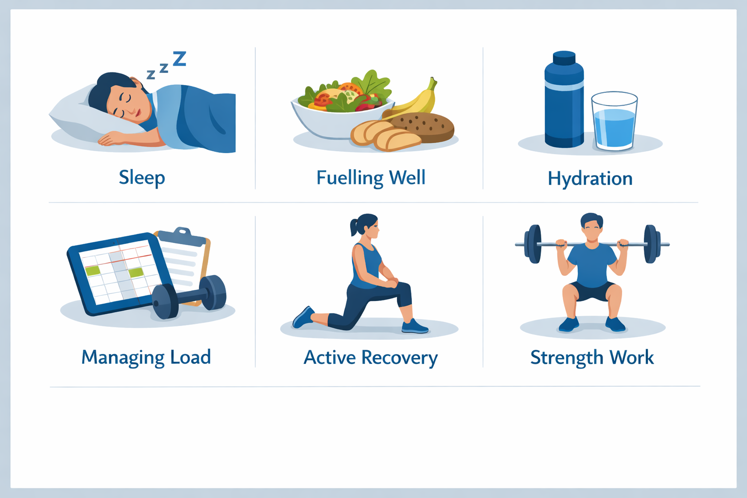 Sleep, fuelling well, sensible training loads and appropriate strength work all help the body cope with the stresses of sport and recreational activity.